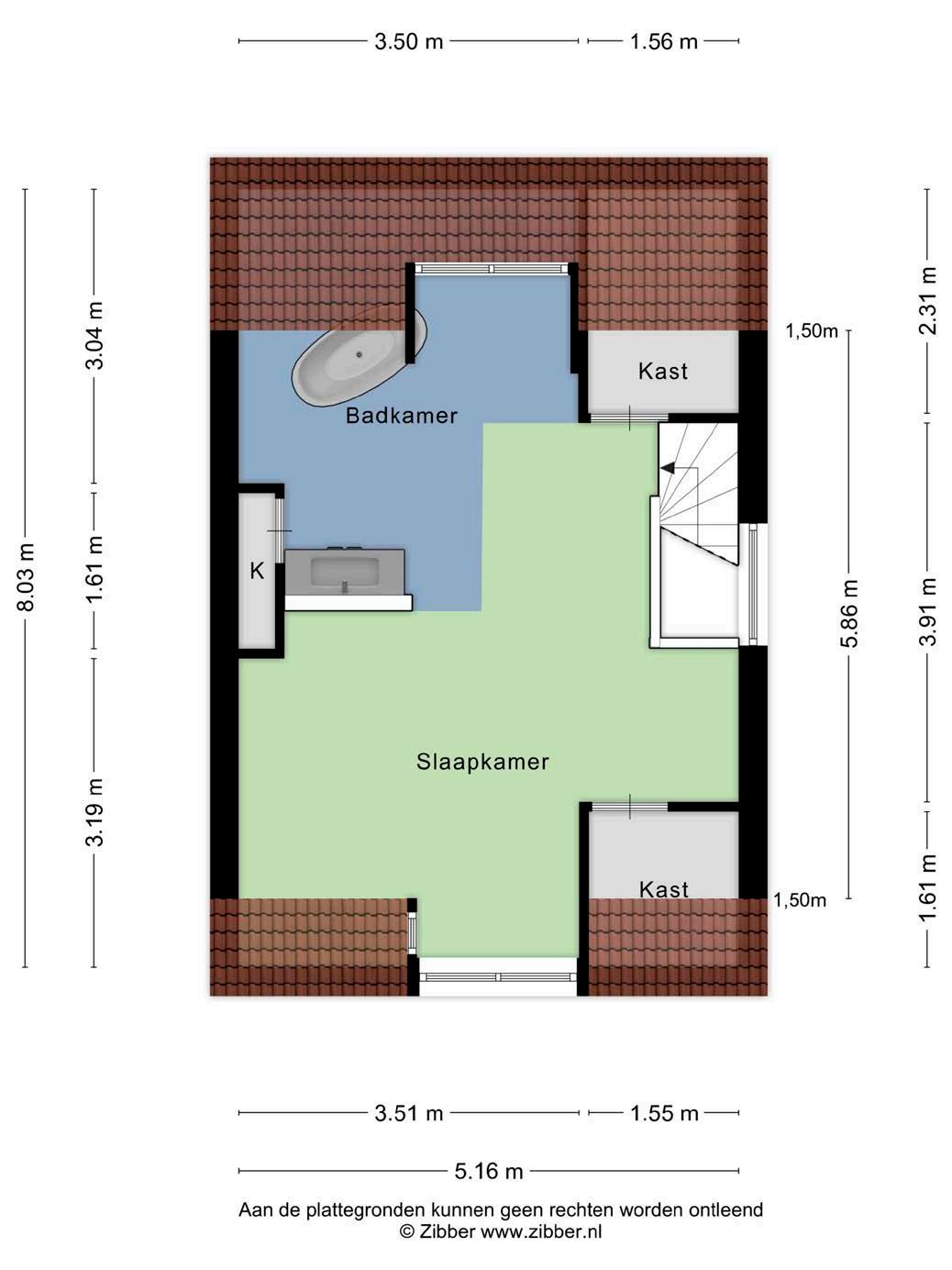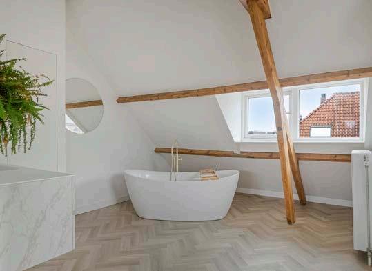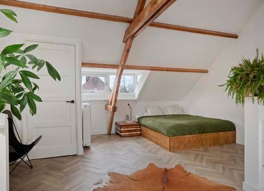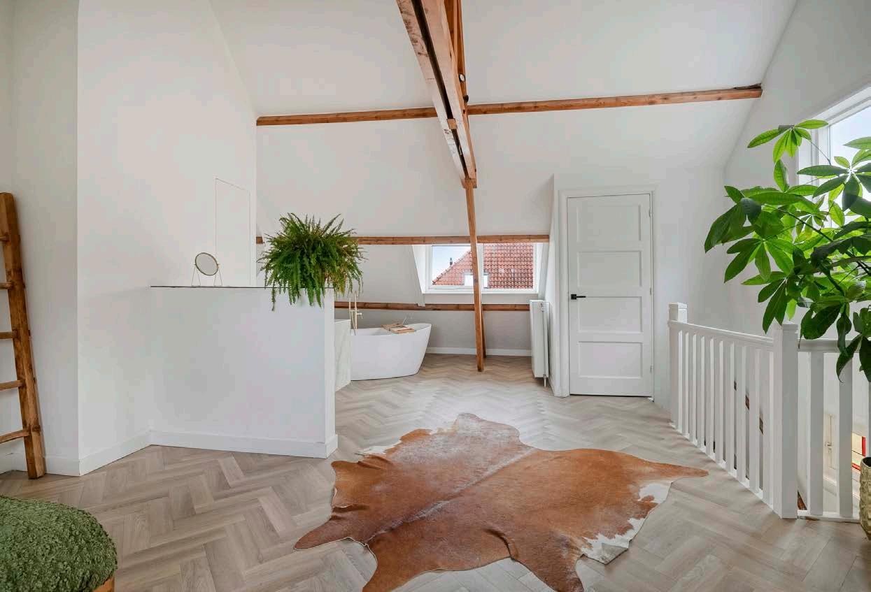 Via een vaste trap kom je op de tweede verdieping, en hier zul je even stil worden. Wat een ruimte, wat een luxe! De hoge plafonds met houten spanten en dakkapellen maken dit een unieke slaapkamer. Het aanwezige vrijstaande ligbad en het marmeren look wastafelmeubel maken deze verdieping bijna hotelwaardig. Je vindt hier ook een grote hoeveelheid praktische bergkasten én de opstelling van de combiketel.