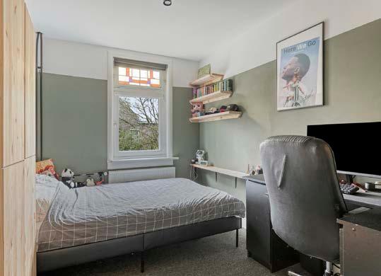 De charme van deze woning zet zich moeiteloos voort op de eerste verdieping. Een ruime overloop geeft toegang tot drie fijne slaapkamers. De twee kamers aan de voorzijde hebben een spectaculair uitzicht op het Theresiaplein, met de historische Theresiakerk in het vizier. De grote ouderslaapkamer aan de achterzijde biedt een oase van rust, compleet met glas-in-loodramen.