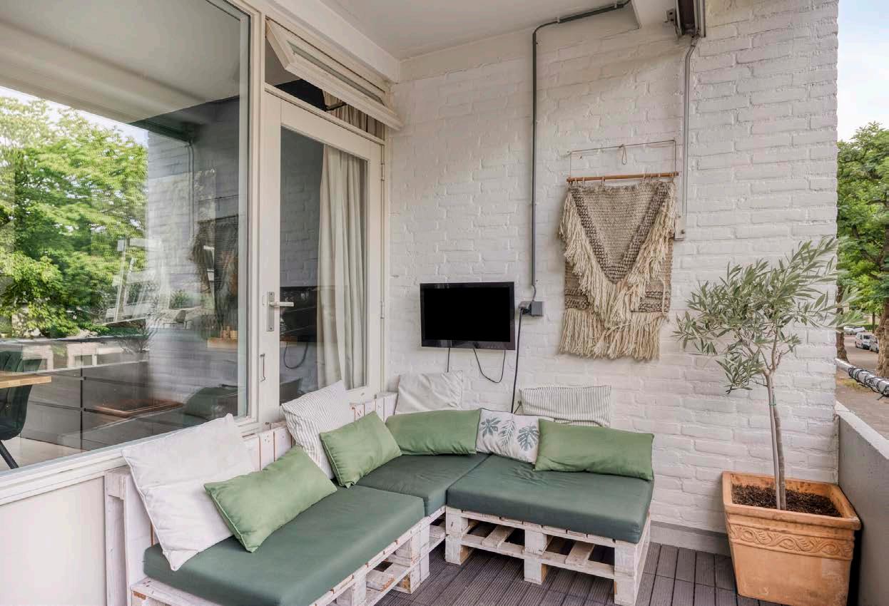 De woning beschikt over twee zonnige balkons met vrij uitzicht op een groen plantsoen. Het balkon aan de achterzijde, gelegen op het westen, is ruim genoeg voor een eettafel en voorzien van een zonneluifel – perfect voor lange, ontspannen zomeravonden.