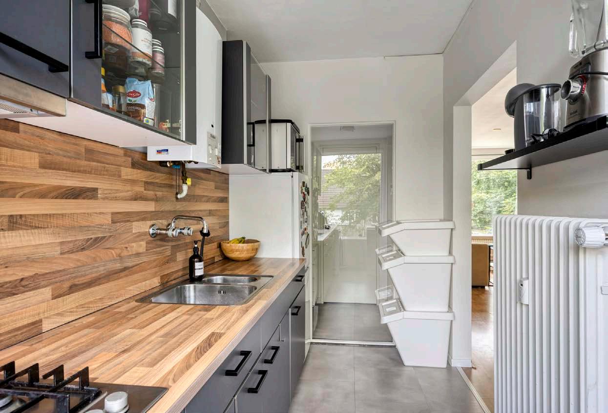 De open keuken is modern en compleet ingericht, met onder andere een gaskookplaat en een praktische 1,5 spoelbak. Een fijne plek om te koken en in contact te blijven met de woonruimte.