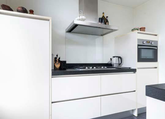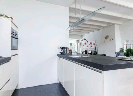 In de open keuken kun je heerlijk kokkerellen, de deuren open naar het dakterras met uitzicht op de kids die veilig beneden kunnen spelen in de tuin.
