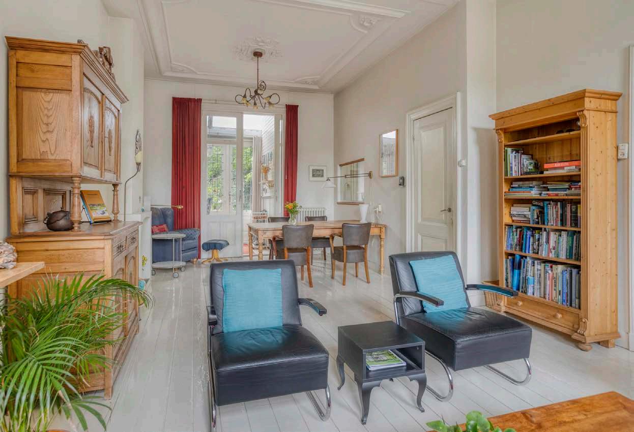Vanuit de woonkamer heeft u vrij zicht over het Burgemeestersplein met daarachter Park Sonsbeek.