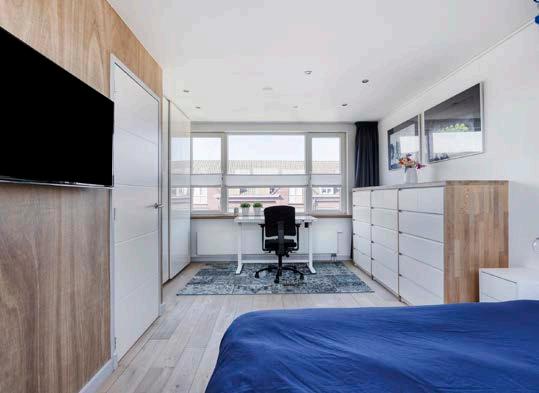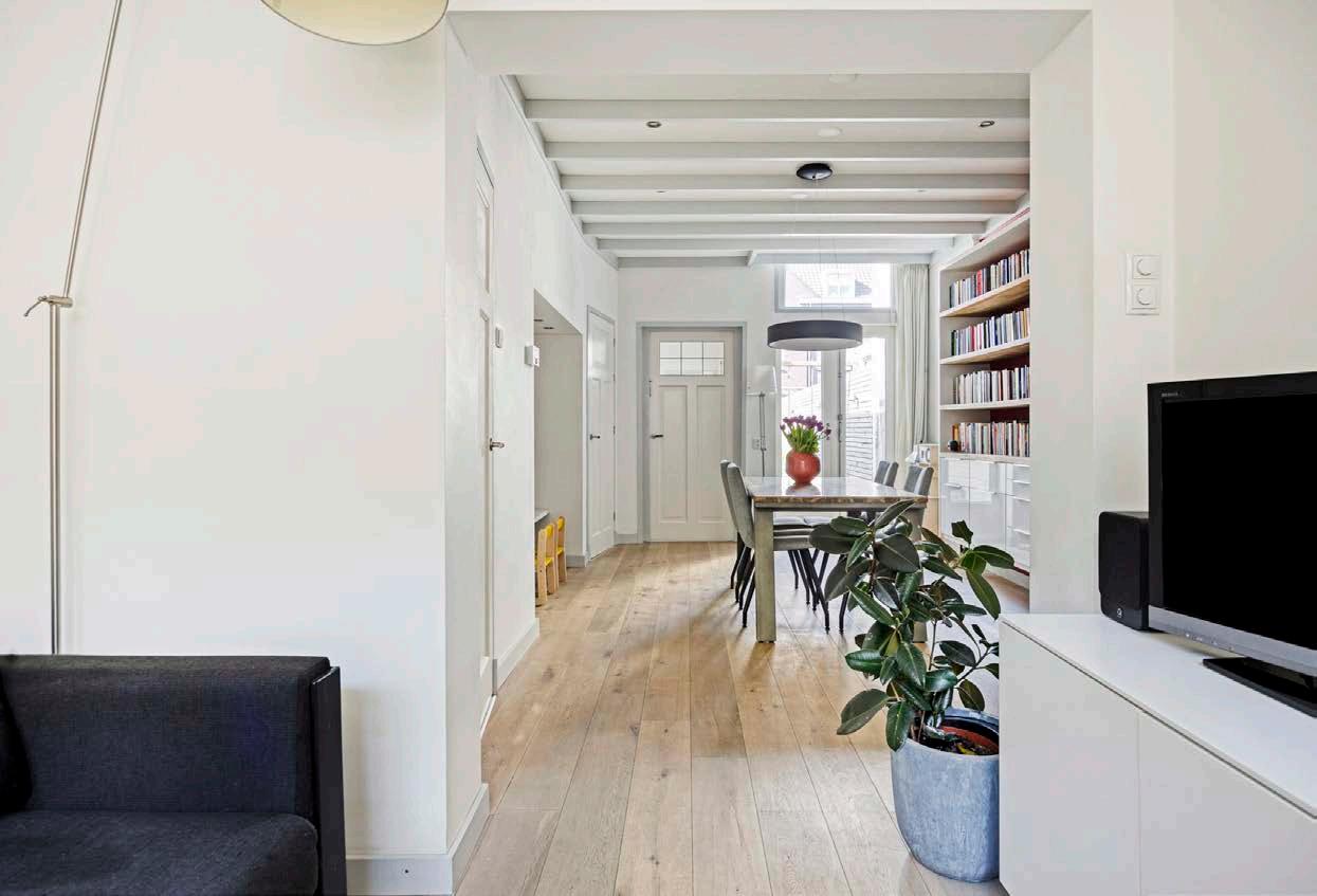 De ruime woonkamer is een oase van licht en ruimte dankzij de brede eiken vloer in white wash en de grote openslaande tuindeuren. Deze leiden je direct naar de diepe achtertuin, waardoor binnen en buiten naadloos in elkaar overgaan. De charmante nis, een knipoog naar de vroegere bedstee, biedt een knus hoekje voor een boek of een speelhoek voor de kinderen. Het is de ideale plek voor gezellige avonden met familie en vrienden, waar de sfeer altijd warm en uitnodigend is.