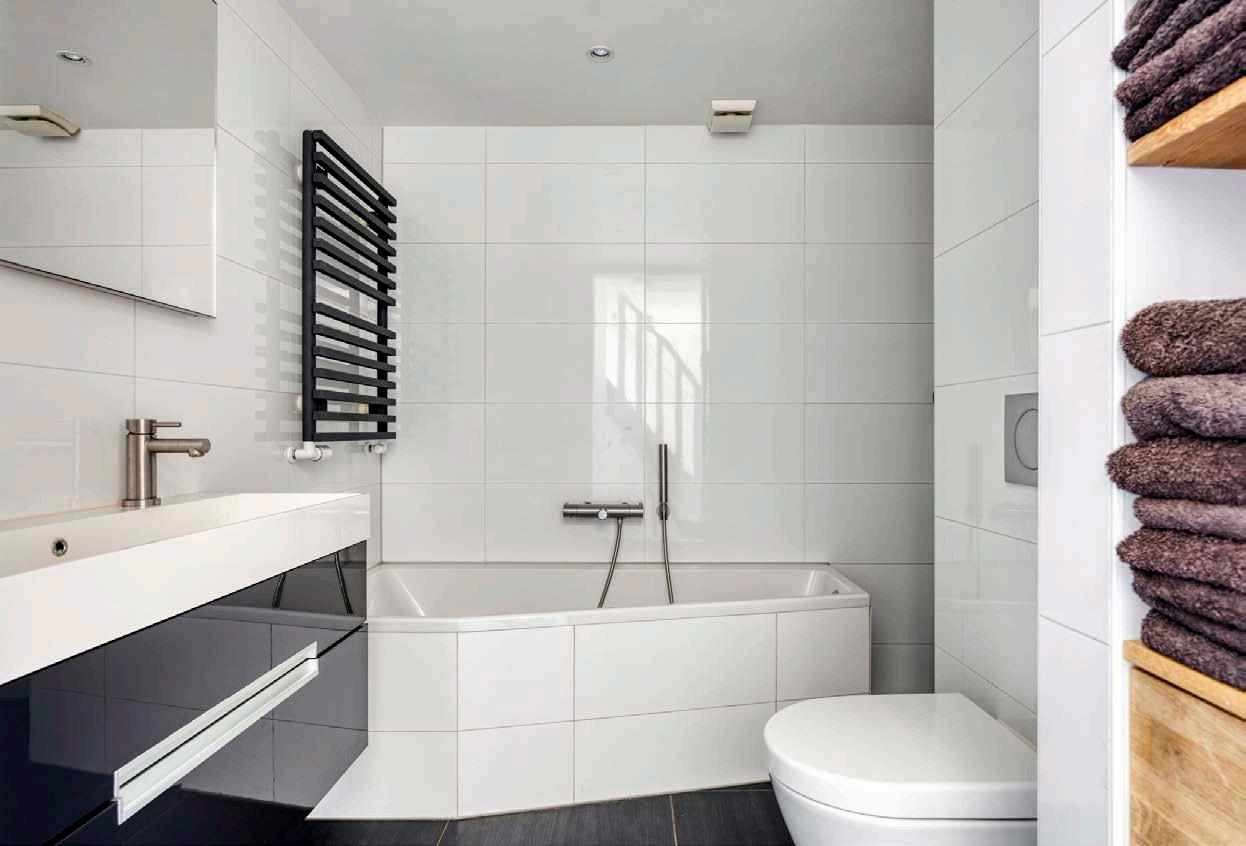 De moderne badkamer uit 2015 is een ware spaervaring, compleet met een ligbad, inloopdouche en breed badmeubel met verlichte spiegel. Hier kun je je na een lange dag heerlijk ontspannen.