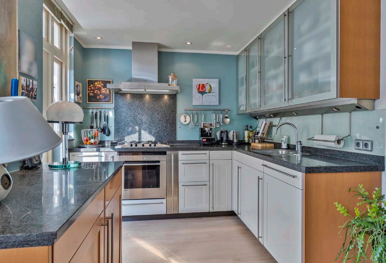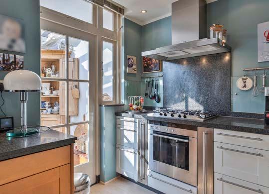 De keuken is voorzien van inbouwapparatuur en biedt toegang tot de lichte serre.