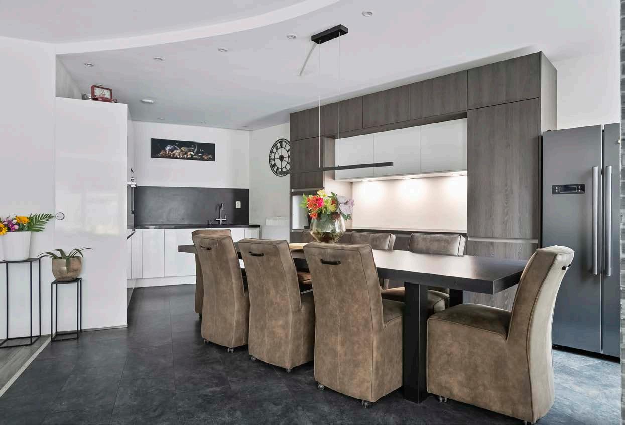 De moderne keuken is onlangs in 2022 vernieuwd en biedt alle gemakken die je van een hedendaagse keuken mag verwachten. Gezelligheid en functionaliteit vinden elkaar hier, met een kwalitatief laminaat dat past bij de rest van de woning. Met inbouwapparatuur zoals een 4-pits inductiekookplaat, combi-oven, koelkast, vriezer een composiet aanrechtblad. Door de open indeling blijf je in contact met je gasten of het gezin.