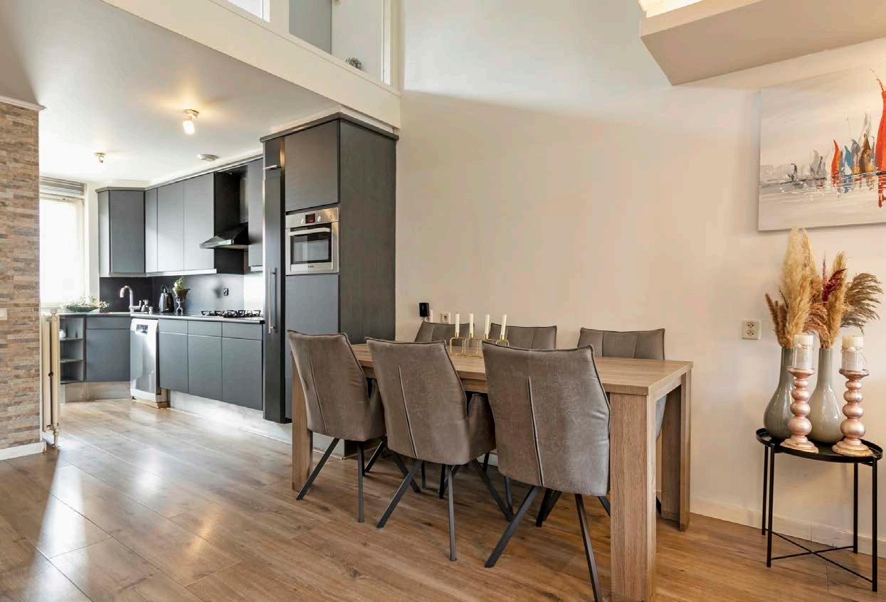 De ruime, tuingerichte woonkamer met open indeling is voorzien van een mooie grote pui en prachtige vide, waardoor het licht en de ruimte goed tot zijn recht komen. De moderne, strakke afwerking geeft het geheel een stijlvolle uitstraling en maakt dat je hier vrijwel meteen je spullen neer kunt zetten.
