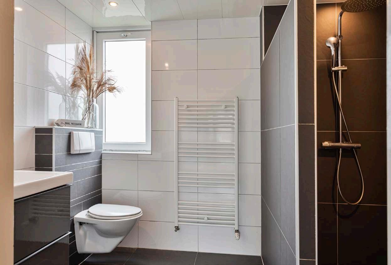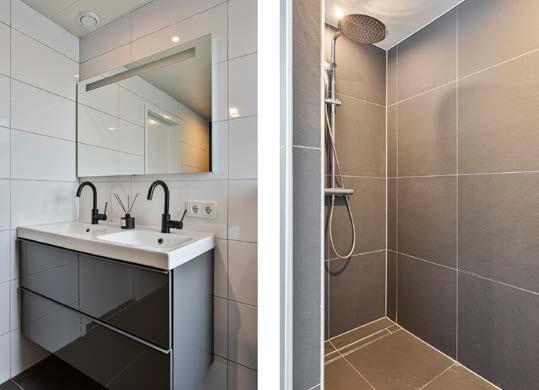 De nette badkamer heeft is van alle gemakken voorzien die dagelijkse routines tot een plezier maken. De badkamer is voorzien van een inloopdouche, toilet, spiegel en dubbele wastafel met meubel.