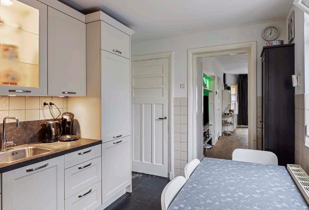 De woonkeuken is een droom voor elke thuischef. Met een praktische hoekopstelling en moderne apparatuur zoals een groot 5-pits fornuis met grote oven en een afzuigschouw, is koken hier een plezier. De toegang tot de kelderkast zorgt voor extra opslagruimte, perfect voor al je culinaire voorraad. In de aangrenzende bijkeuken vind je een zee aan opbergruimte en plek voor de was- en droogapparatuur, netjes weggewerkt achter schuifdeuren. Hier tref je ook het toilet aan.
