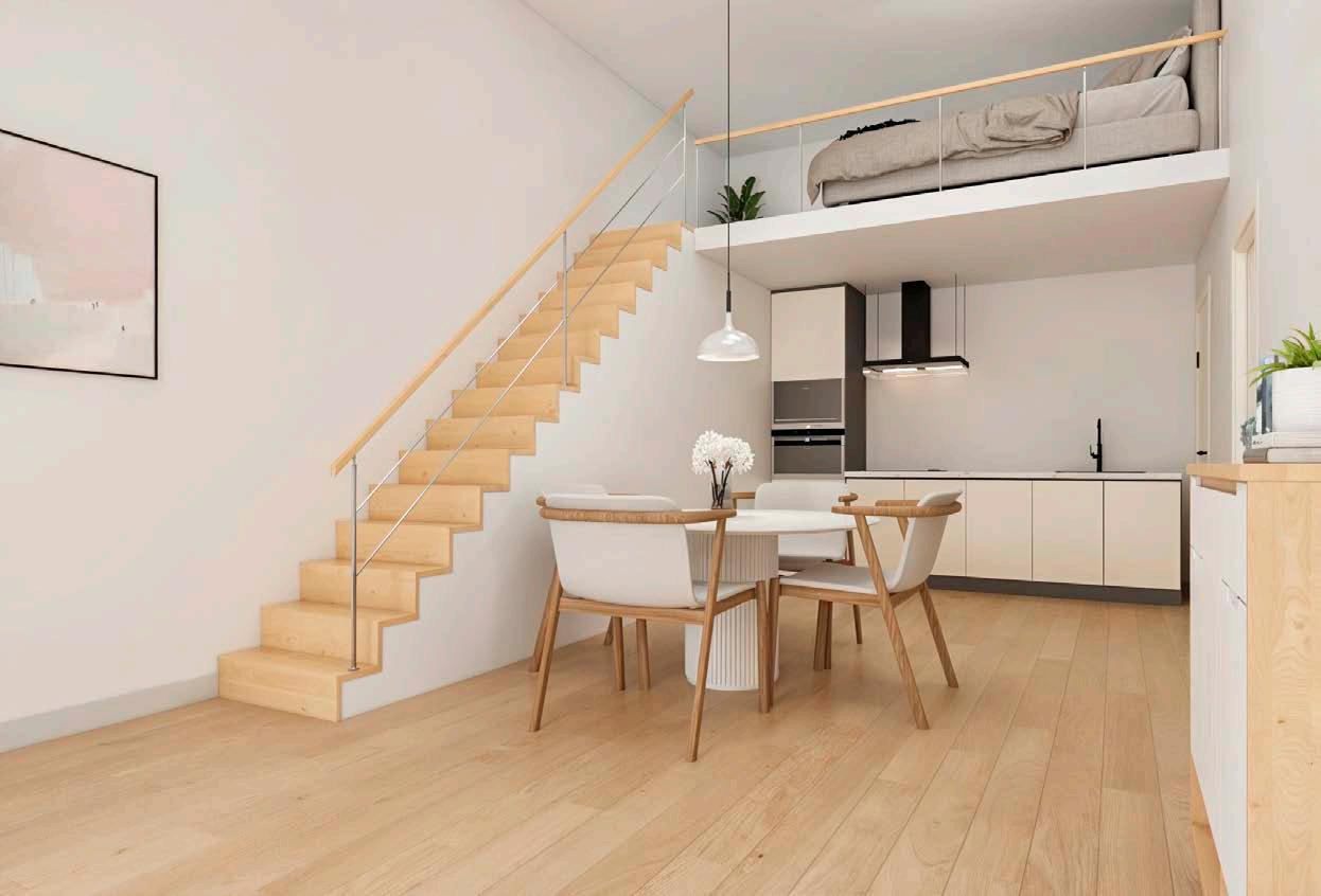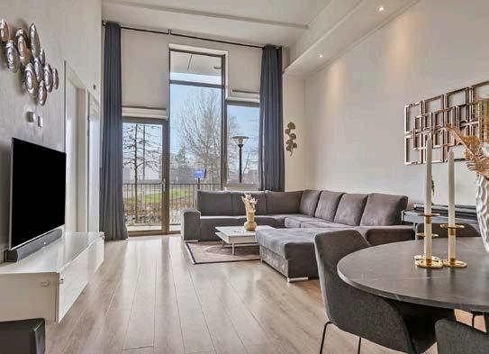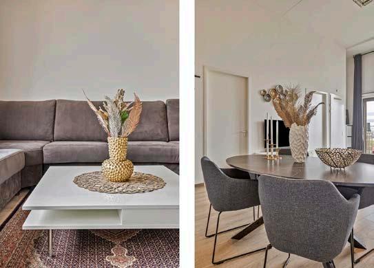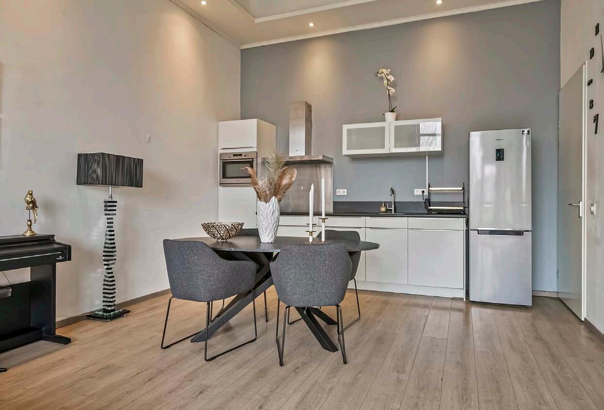 De woonkamer biedt hoge plafonds en is stijlvol met een laminaatvloer en vloerverwarming. De strak gestuukte wanden dragen bij aan een moderne uitstraling. De ruimte is flexibel in te richten, met voldoende ruimte voor een comfortabele zit- en eethoek waar je heerlijk kunt ontspannen of gasten kunt ontvangen.