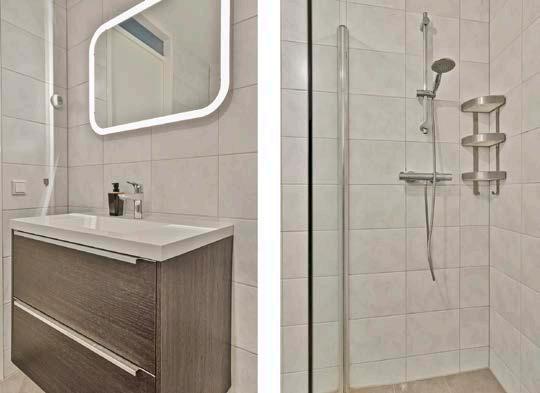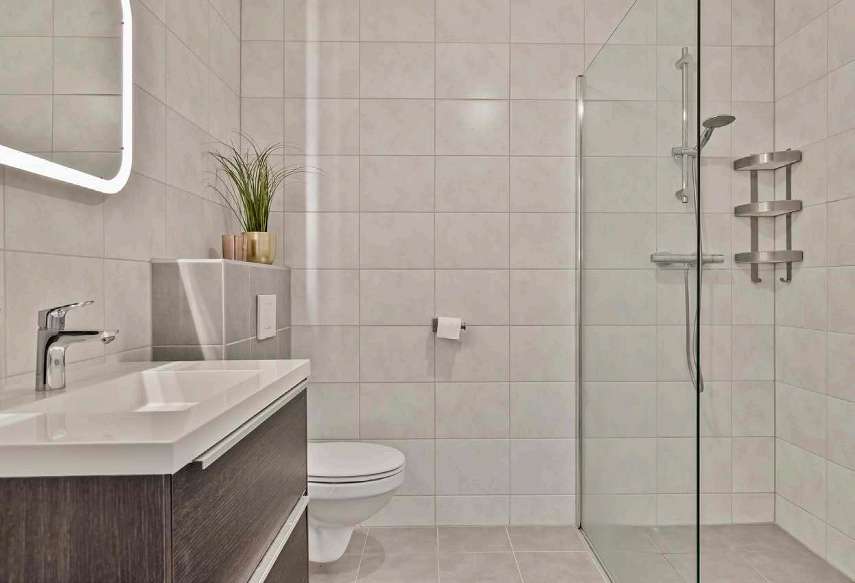 De badkamer is modern en netjes afgewerkt, compleet met een inloopdouche, wastafelmeubel en toilet. Hier start je je dag fris en ontspannen.