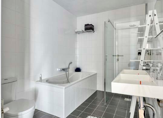 De badkamer is compleet. Stap onder de royale inloopdouche of geniet van een ontspannend bad aan het einde van de dag. De dubbele wastafel biedt voldoende ruimte.