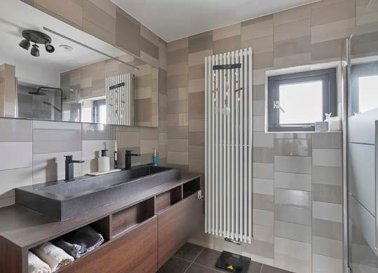 De badkamer op de tweede verdieping is uitgerust met goede faciliteiten, waaronder een inloopdouche, toilet en een dubbele wastafel. Daarnaast is er een praktische kast, op de tweede verdieping, met een wasmachine-opstelling, die zorgt voor extra opbergruimte.