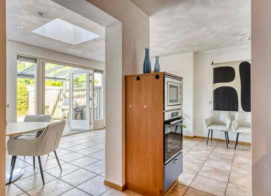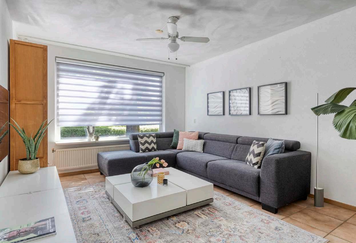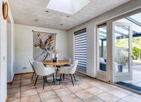 De royale woonkamer met tegelvloer en vloerverwarming biedt een prettige lichtinval dankzij de grote raampartijen. Aan de voorzijde is de sfeervolle zithoek gesitueerd, terwijl aan de achterzijde de woning is uitgebouwd met een royale eetkamer. Hier zorgen de lichtkoepel en de openslaande tuindeuren voor een fijne verbinding tussen binnen en buiten.