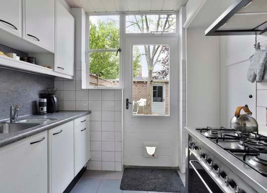 De halfopen keuken is praktisch ingericht met veel bergruimte en diverse inbouwapparatuur, waaronder een oven, 5-pits gasfornuis, afzuigkap, koelkast, 4-laden vriezer en spoelbak. Vanuit de keuken is er toegang tot de achtertuin.