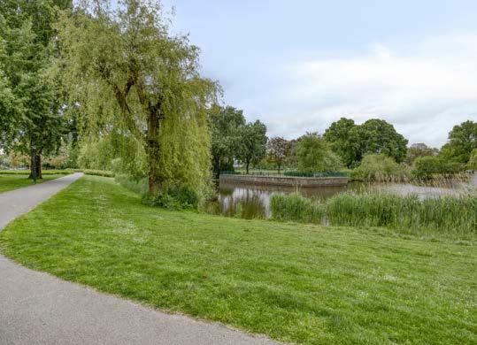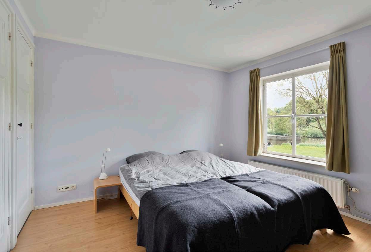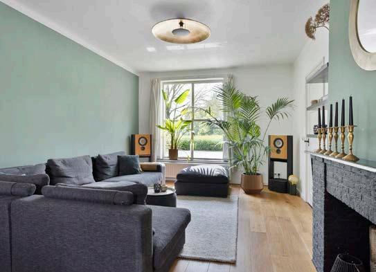 De lichte doorzonwoonkamer biedt een prachtig vrij uitzicht op het park aan de voorzijde en is afgewerkt met een warme eiken vloer, strak gestuukte wanden en plafond, open haard, vaste inbouwkast en grote raampartijen die zorgen voor veel daglicht.