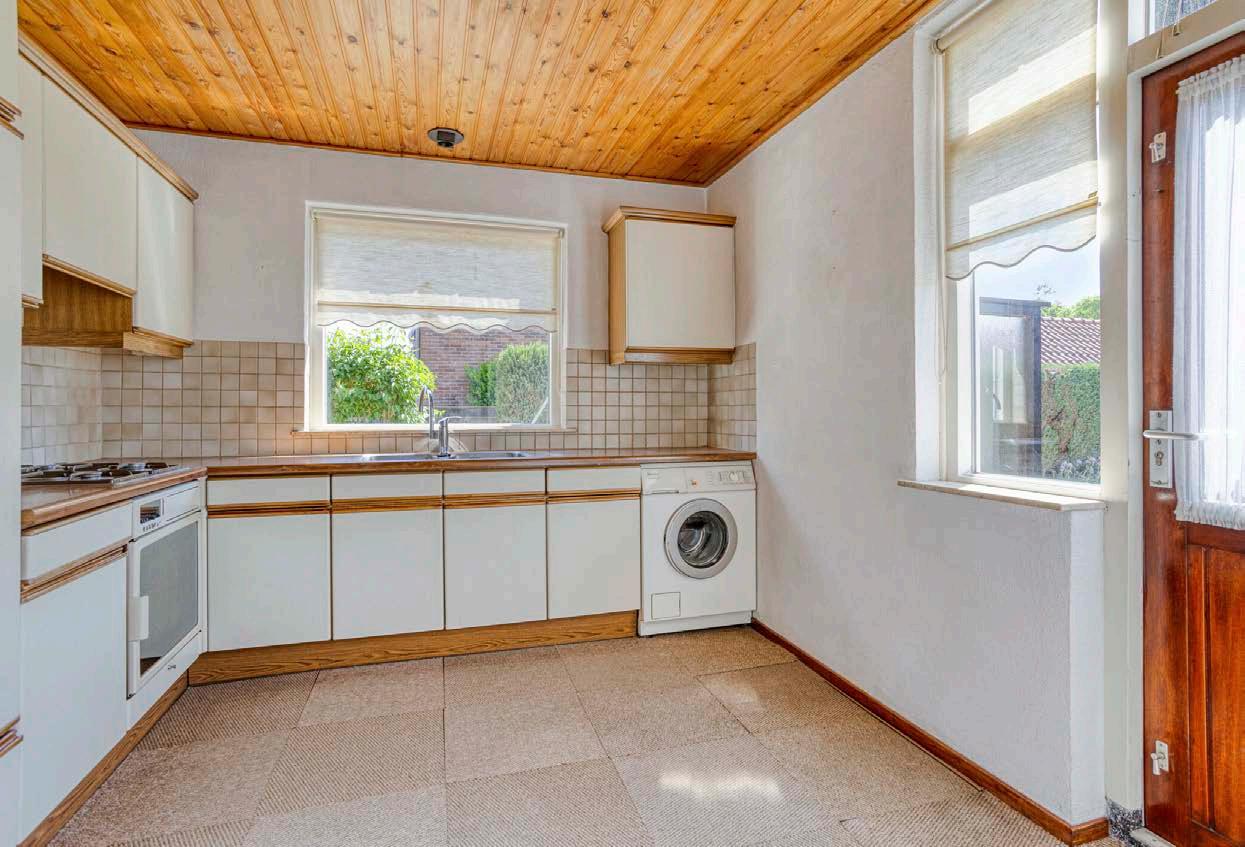 De keuken, aan de achterzijde van het huis, is compact en praktisch opgezet met alles wat je nodig hebt binnen handbereik. Het directe uitzicht op je fijne achtertuin maakt het koken nog net wat leuker.