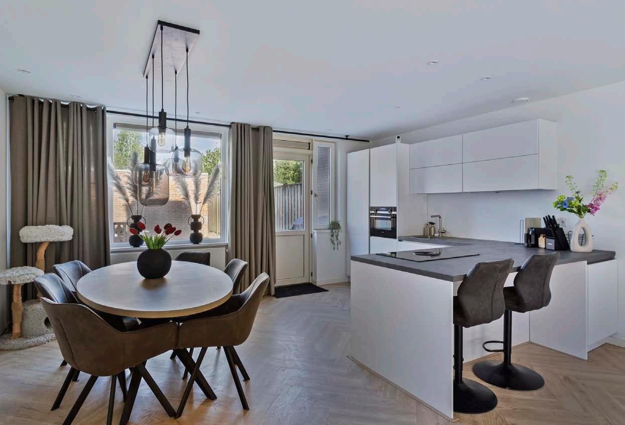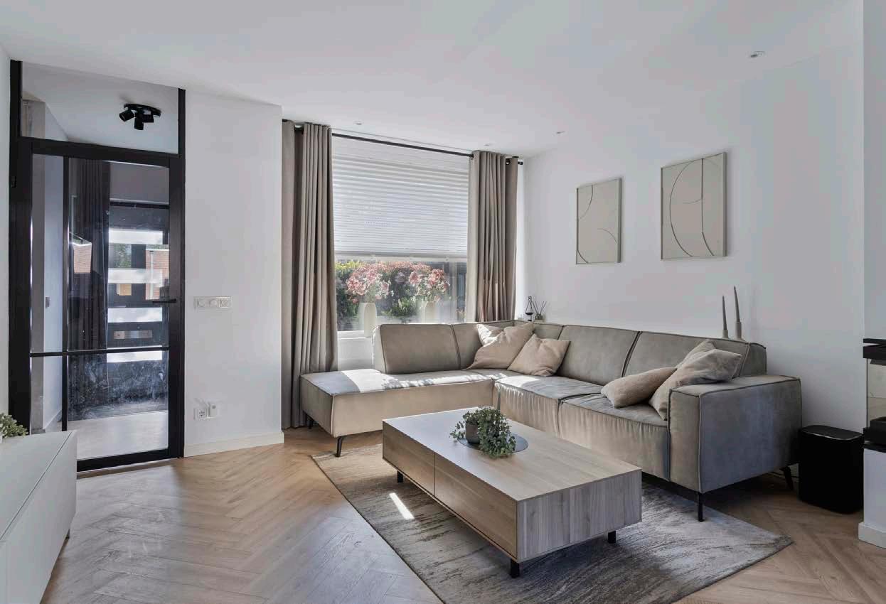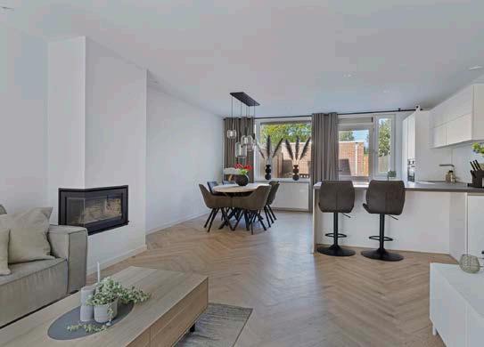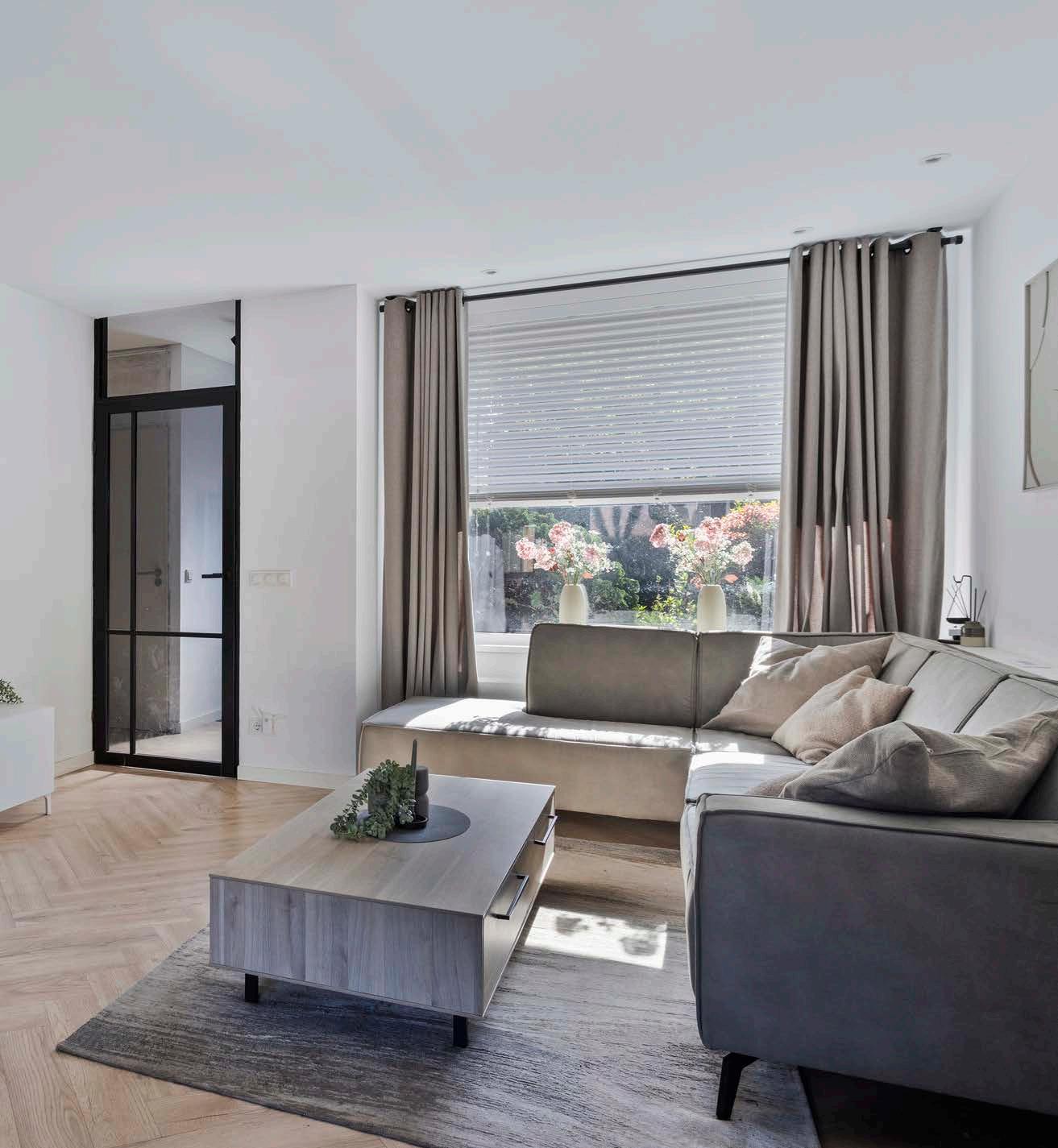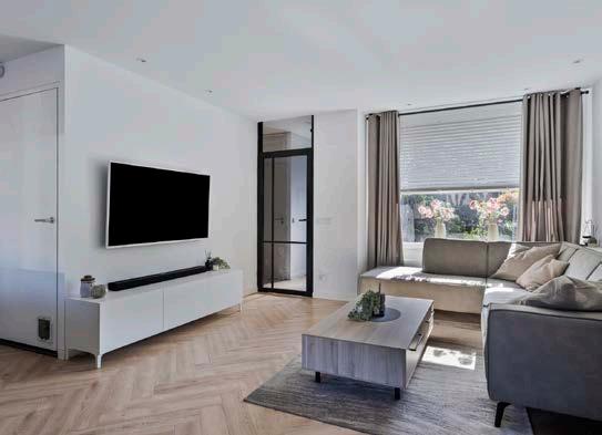 De open woonkamer is afgewerkt met strak gestuukte wanden en een prachtige visgraatvloer die direct de juiste sfeer neerzet. De grote raampartijen zorgen voor een prettige lichtinval en verbinden binnen met buiten.