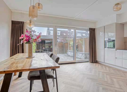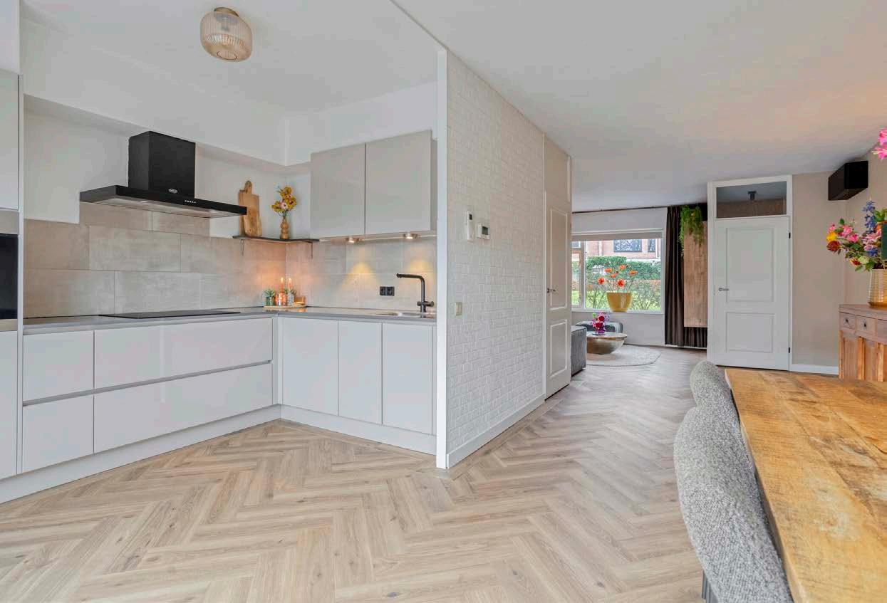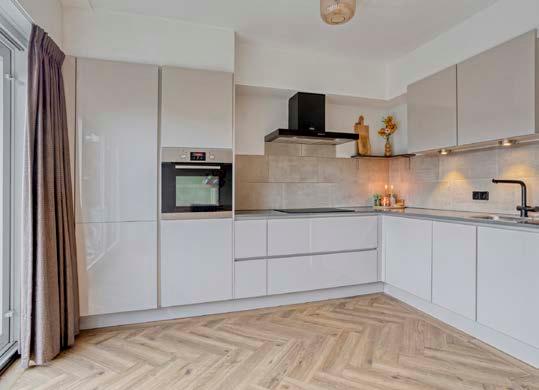 De keuken bevindt zich aan de achterzijde en biedt een fijne plek om te koken en samen te eten. Deze moderne keuken heeft diverse inbouwapparatuur, waaronder een inductiekookplaat uit 2025, en via de grote schuifpui wandel je zo de zonnige achtertuin in. De tuin ligt op het zuiden: ideaal om het hele jaar door te genieten van buitenleven, bijvoorbeeld onder de overkapping.