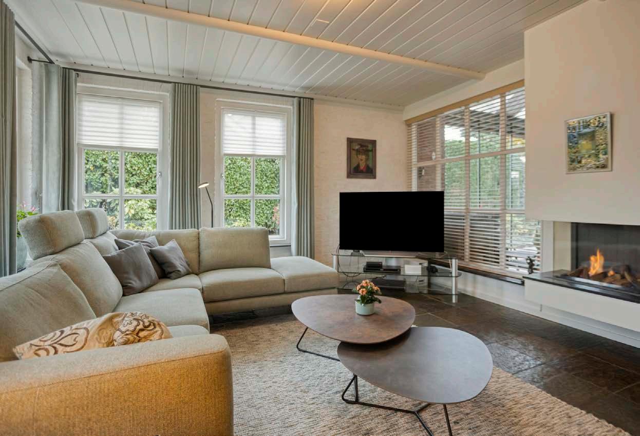 De sfeervolle woonkamer ademt gezelligheid door de unieke Rembrandts leistenen vloer en een knusse gaskachel. Een perfecte plek voor ontspannen avonden met je gezin of als gezellige ruimte tijdens feestelijke momenten.