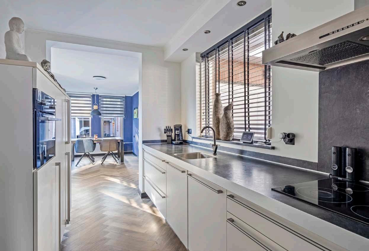 Vanuit de woonkamer heb je toegang tot de keuken, die compleet is uitgerust met moderne inbouwapparatuur. Denk aan een inductiekookplaat, vaatwasser, combimagnetron en koelkast. Hiermee heb je alles bij de hand om uitgebreid te koken of snel een maaltijd te bereiden.