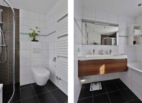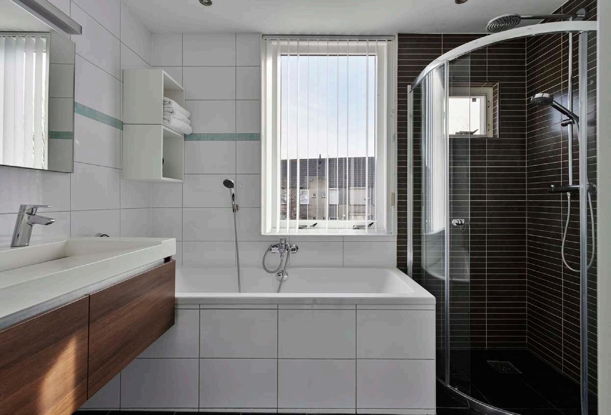 De badkamer is een oase van rust met zijn sfeervolle betegeling en luxe voorzieningen. Of je nu een snelle douche in de ochtend of een ontspannen bad in de avond verkiest, deze ruimte biedt het allebei.