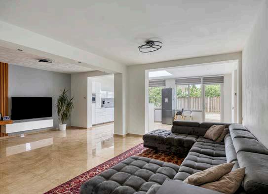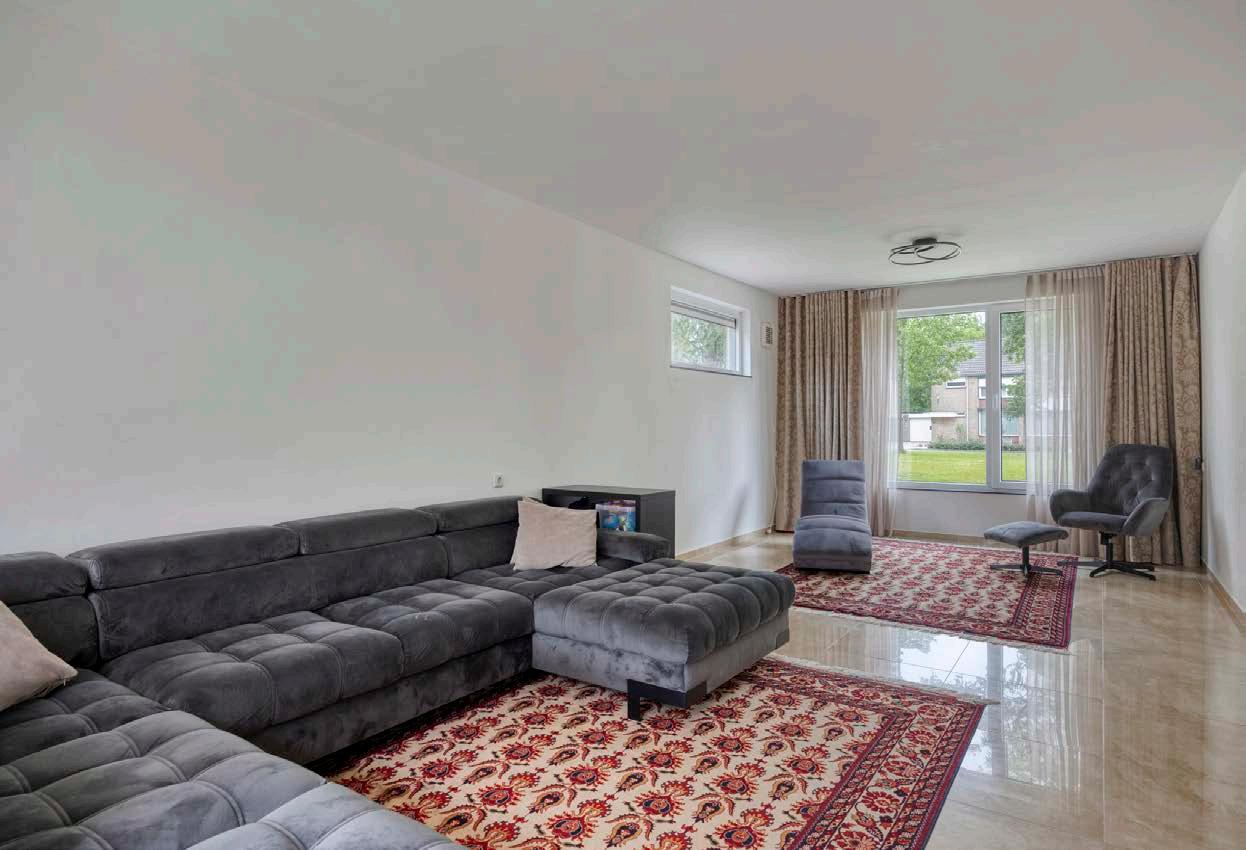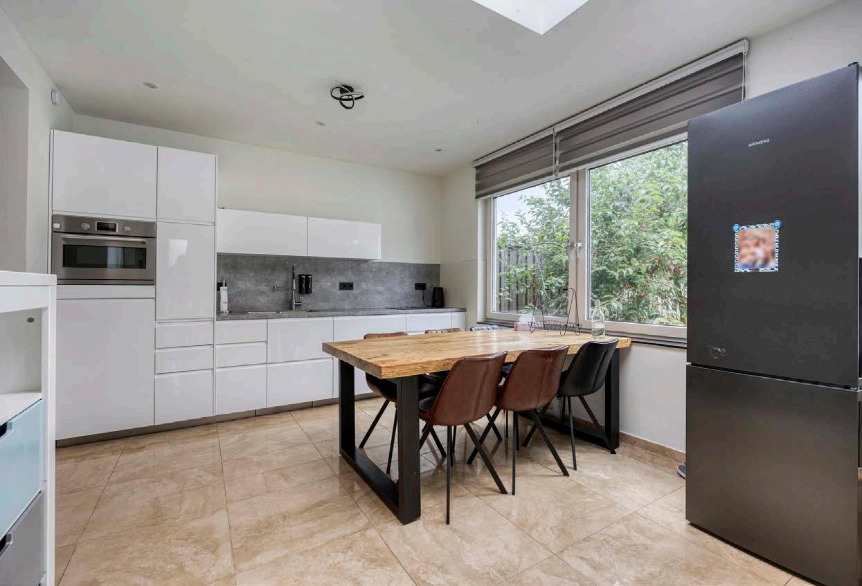 De ruime, uitgebouwde woonkamer is het kloppende hart van deze woning. Dankzij de grote ramen valt het daglicht hier prachtig naar binnen, wat zorgt voor een heerlijke, lichte sfeer. De moderne afwerking en de royale ruimte maken het dé plek waar jij en je gezin samenkomen: of het nu is om lekker te ontspannen op de bank, te knutselen aan de eettafel of spelletjesavonden met vrienden te organiseren. De extra ruimte door de uitbouw biedt zoveel mogelijkheden; het voelt als pure luxe in het dagelijks leven.