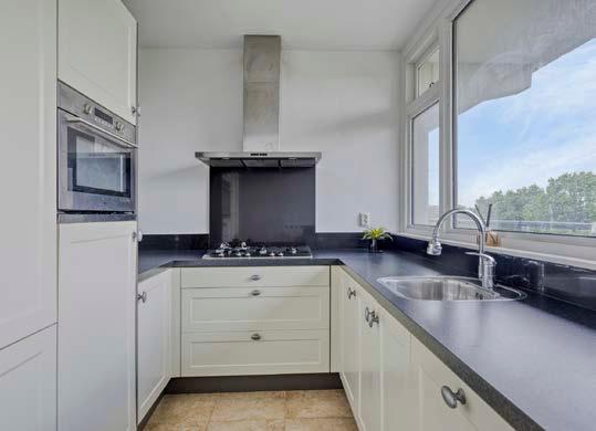 De keuken is netjes en handig in een u opstelling. De stijl is toegankelijk en de keuken beschikt over alle apparatuur die je nodig hebt. In de keuken bevindt zich ook de aansluiting voor wasmachine en droger. Deze zijn mooi weggewerkt in een inbouwkast. Met een woonoppervlakte van 75m² beschik je over genoeg ruimte om jouw eigen draai aan de inrichting te geven.