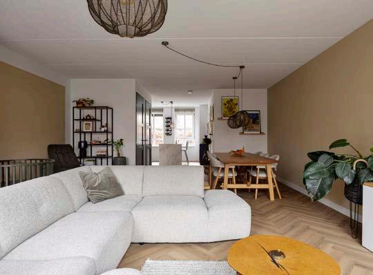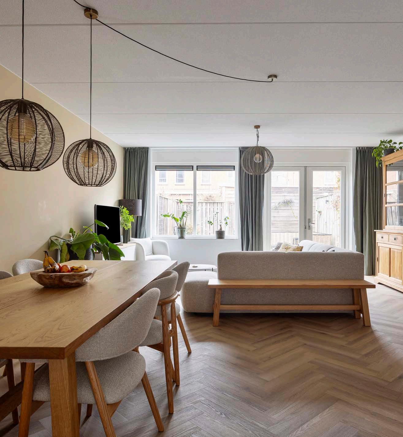 De ruime, uitgebouwde woonkamer vormt het warme hart van de woning en biedt dankzij de uitbouw aan de achterzijde een fijne leefruimte. Door de royale opzet is er meer dan voldoende plaats voor een comfortabele zithoek én een grote eettafel, waardoor het een ideale plek is om te ontspannen of uitgebreid te dineren met familie en vrienden. De stijlvolle visgraat PVC-vloer geeft de ruimte een luxe en eigentijdse uitstraling, terwijl het duurzame en onderhoudsvriendelijke karakter van PVC zorgt voor optimaal gebruiksgemak. De vloerverwarming draagt bij aan een aangenaam wooncomfort. Dankzij de openslaande deuren naar de tuin geniet de woonkamer van een prachtige lichtinval en een directe verbinding met buiten.