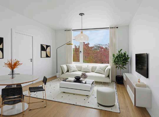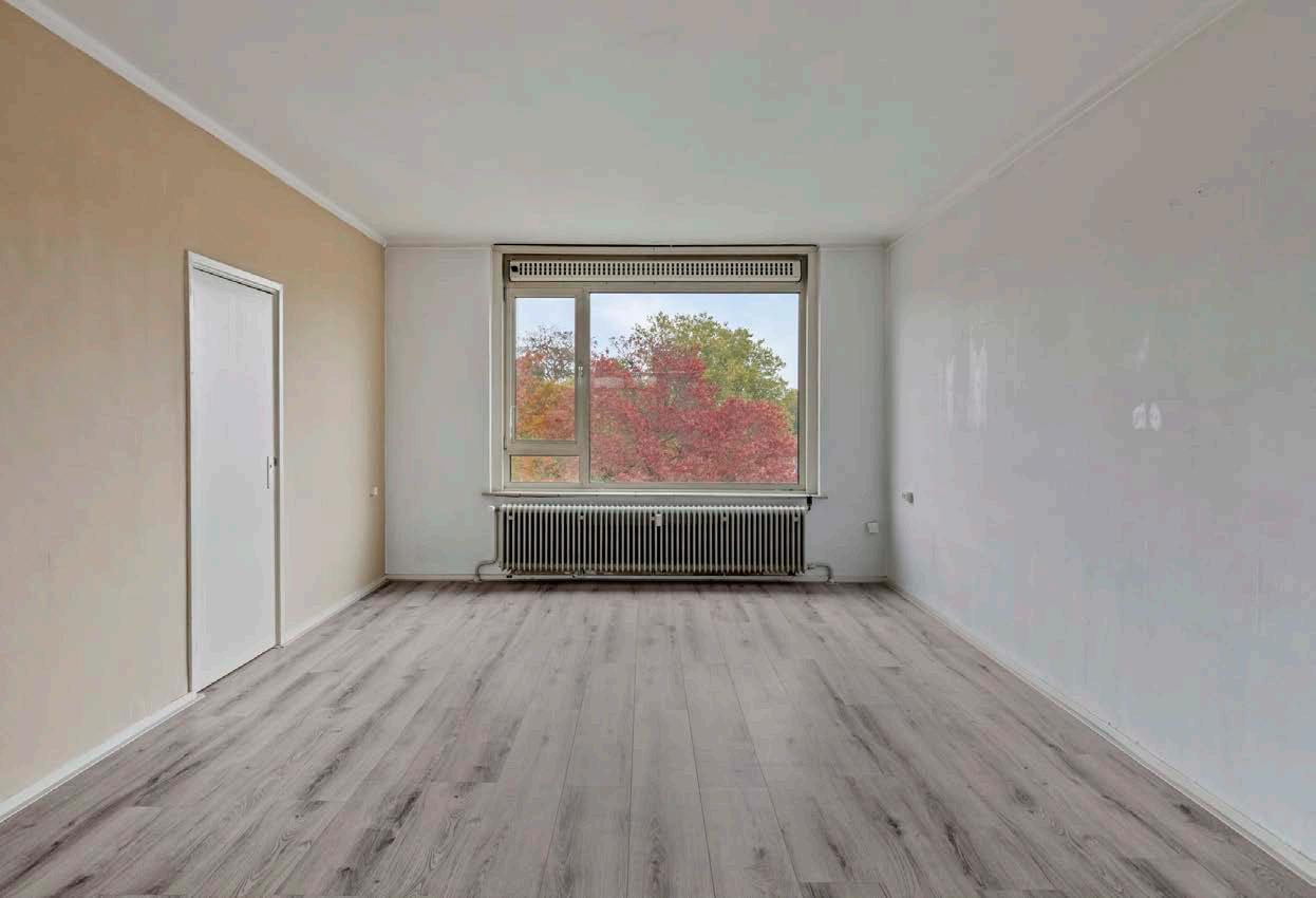 De ruime en lichte woonkamer met grote ramen die een mooi uitzicht bieden over de stad. De lichtinval zorgt voor een aangename sfeer.