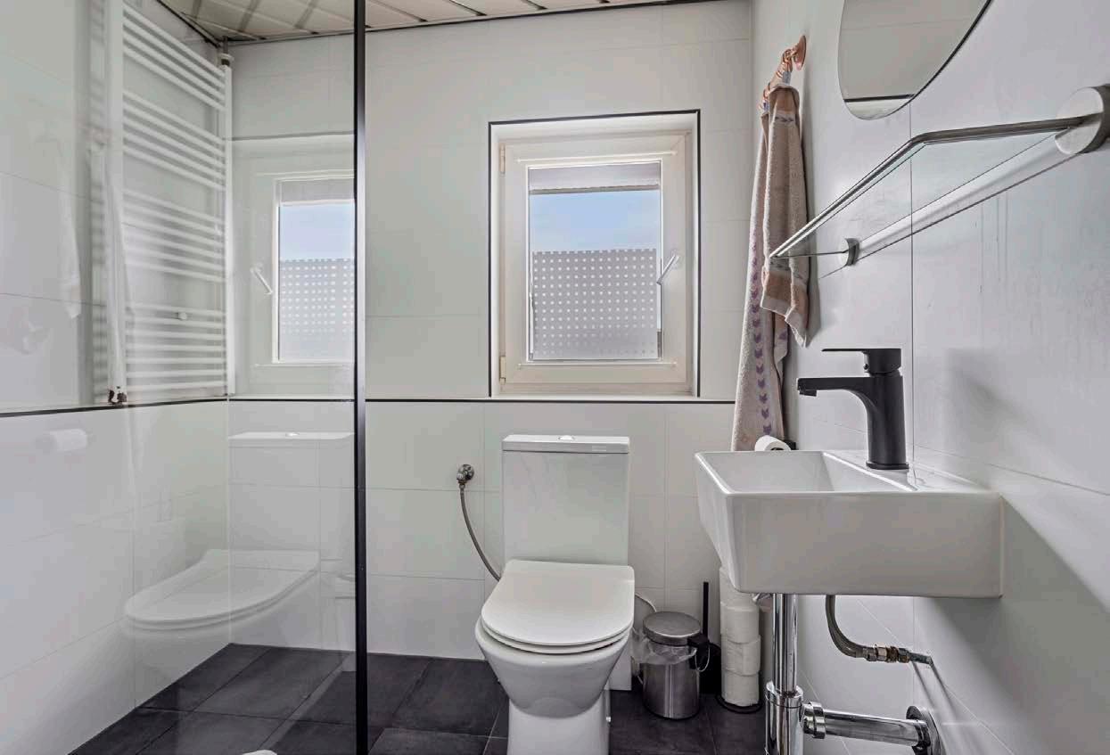 De moderne en lichte badkamer is voorzien van een inloopdouche, wastafel en tweede toilet. Een heerlijke plet om de dag te beginnen of te eindigen.