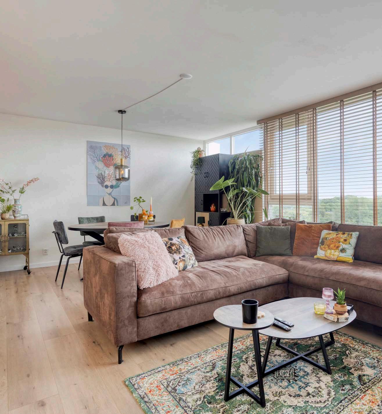 Een riante woonkamer met grote raampartijen dat zorgt voor licht, lucht en uitzicht!