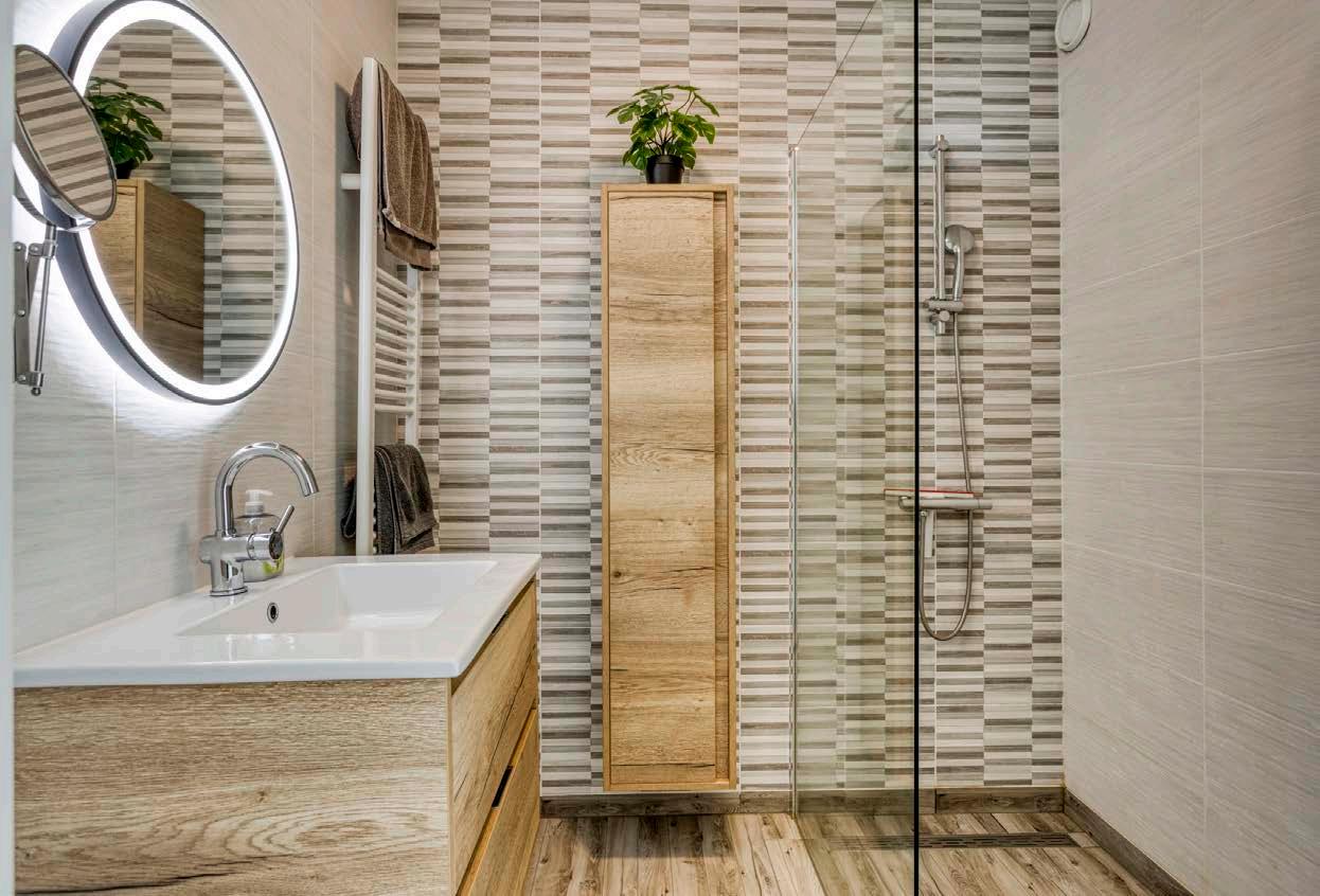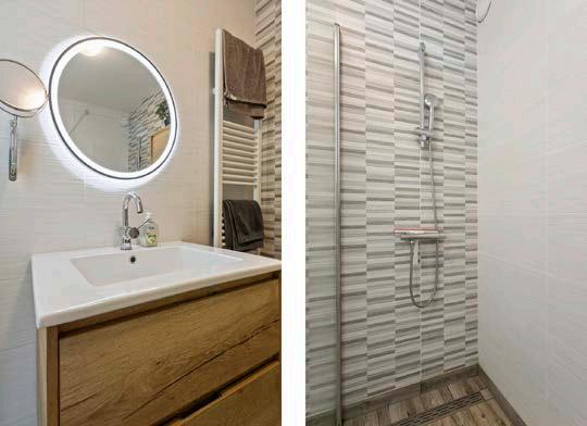 De badkamer is uitgerust met inloopdouche, design radiator en wastafelmeubel