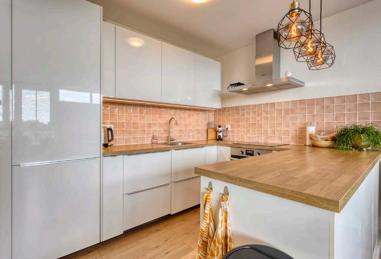 Een moderne open keuken, compleet uitgerust met o.a. kookplaat, afzuigkap, combi-oven, vaatwasser, koelkast en vriezer. Aansluitend een praktische berging/bijkeuken met wasmachine-aansluiting
