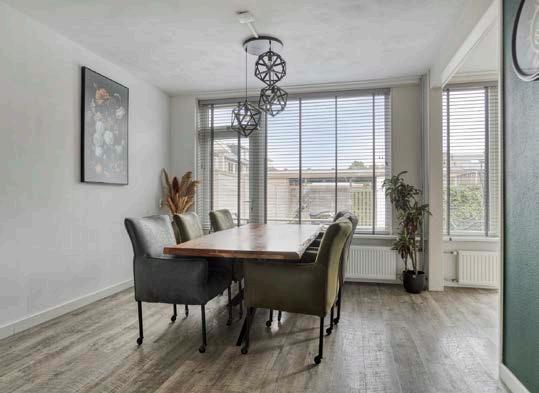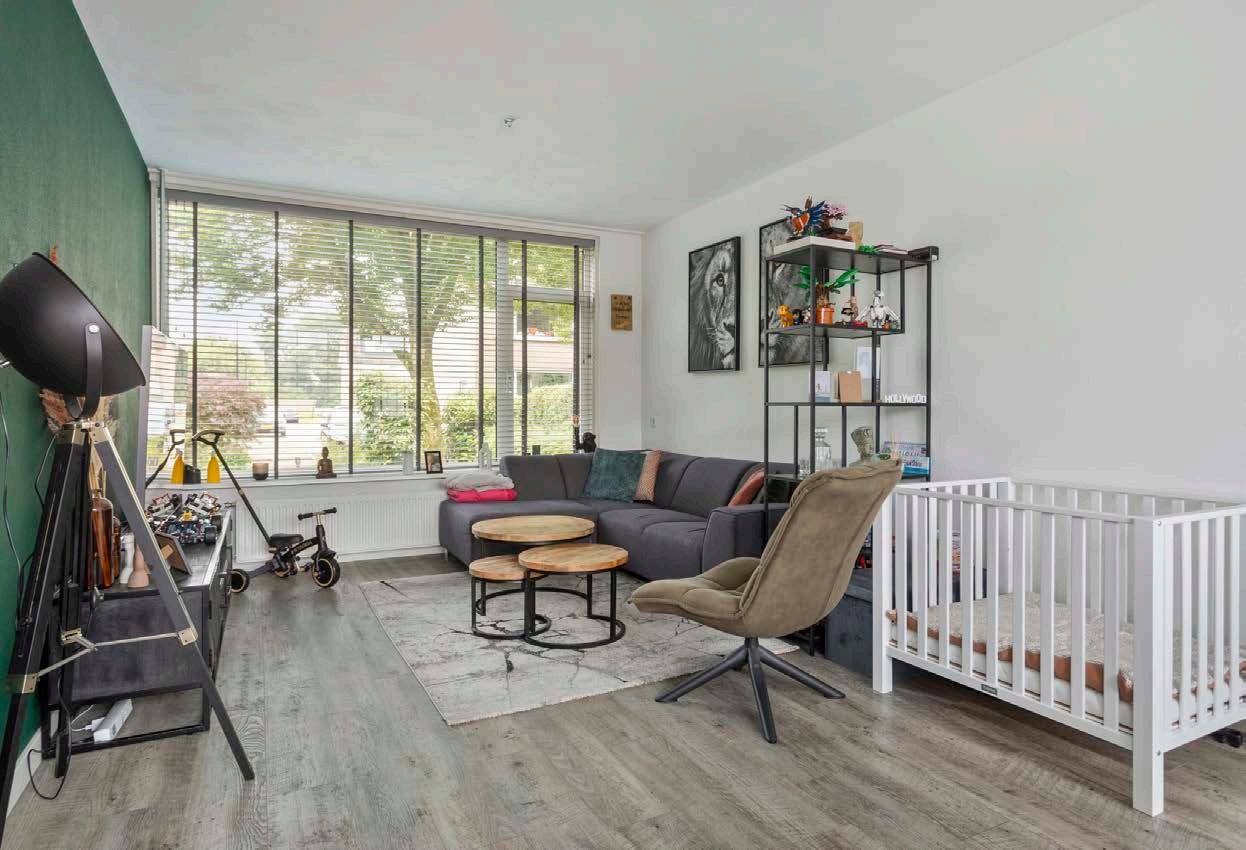 De lichte woonkamer heeft een fijne indeling en een grote raampartij die uitzicht biedt op de achtertuin.