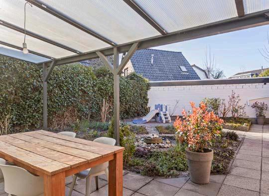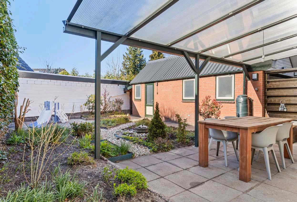 Aan de zijkant van de woning vind je een handige stenen garage, die niet alleen plek biedt voor je auto, maar ook voor extra opslagruimte. Aan de achterzijde van de garage bevindt zich een separate berging met een praktische vliering, ideaal voor het opbergen van seizoensgebonden spullen of sportuitrusting. Deze berging is multifunctioneel en kan ook dienen als hobbyruimte of werkplek voor klussen aan huis. Achter de berging bevindt zich nog een kleine houten opslag, perfect voor tuingereedschap, fietsen of andere buitenmaterialen. Deze extra ruimtes maken het mogelijk om alles georganiseerd en toegankelijk te houden, zodat je optimaal van je woning en tuin kunt genieten.