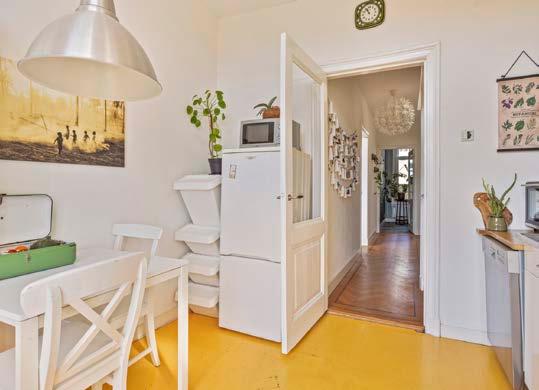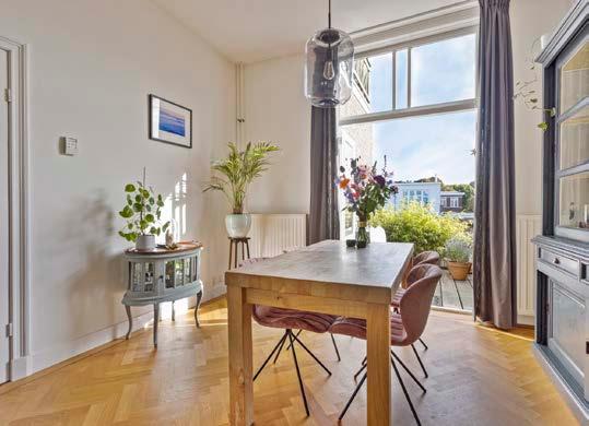 De ruimte is afgewerkt met een prachtige houten visgraatvloer, verfijnd gelegd met een band en bies die het geheel een extra stijlvol en ambachtelijk karakter geven. De hoge plafonds zijn rijk gedecoreerd met sierlijke ornamenten en omlijst met elegant lijstwerk, wat de authentieke uitstraling van de woning benadrukt.