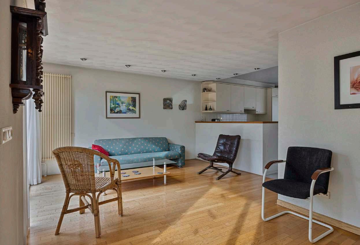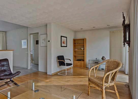 De entree geeft toegang tot de hal met trapopgang naar de eerste verdieping. De woonkamer is ruim en licht dankzij de grote raampartijen, maar vraagt om modernisering.