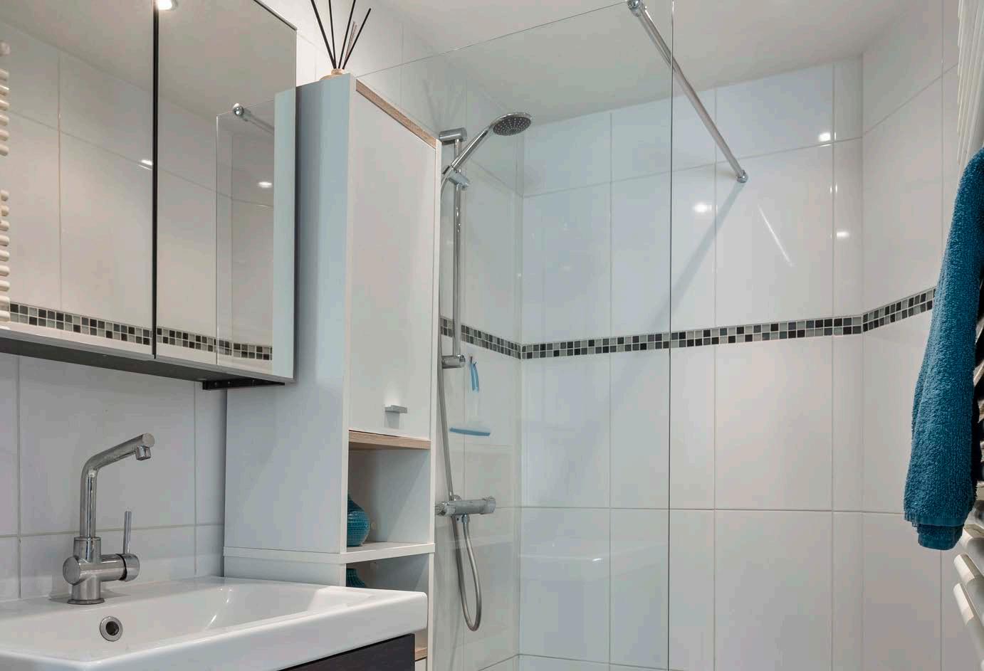 De moderne badkamer is biedt een ruime inloopdouche, spiegel en wastafel met wastafelmeubel, alles voor een verfrissende start van je dag! De praktische indeling ervoor zorgt dat je alles binnen handbereik hebt. Het toilet bevindt zich apart van de badkamer, in de gang.