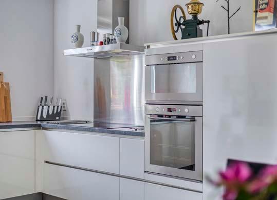 De keuken is modern en praktisch, compleet met inbouwapparatuur en voldoende werkruimte. Een plek waar koken een plezier is, of je nu een driegangenmenu maakt of een snelle maaltijd voor het gezin.