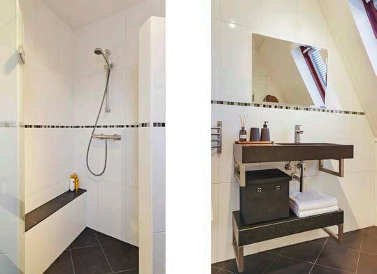 De badkamer is deels betegeld in een neutrale kleurstelling en compleet ingericht met een wastafel, tweede toilet en een aparte douchecabine. Via een vlizotrap is de praktische bergvliering bereikbaar. Hier vinden koffers, kerstcollecties en skiuitrustingen eenvoudig een plekje.