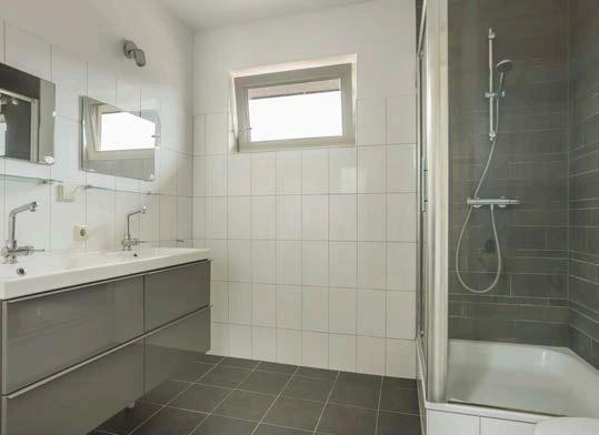 De moderne badkamer is deels betegeld en uitgerust met een douche, dubbel wastafelmeubel en een toilet. Ook kun je de ruimte natuurlijk ventileren dankzij het kleine raam.