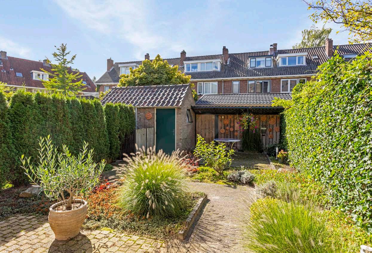 Zonnige achtertuin met berging