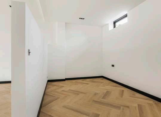 De woonkamer is zeer mooi afgewerkt met een PVC vloer in visgraat motief en de wanden zijn voorzien van glad stucwerk in lichte kleuren. Oftewel een perfecte basis voor vele verschillende interieurstijlen. Het grote raam aan de voorzijde zorgt voor een aangename lichtinval. Het strakke plafond is voorzien van prachtige inbouwspots.