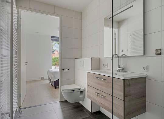 De badkamer voelt als een spa aan huis. Met een inloopdouche, stijlvol badmeubel en wandcloset kun je hier volledig ontspannen. De hoogwaardige materialen en het strakke design onderstrepen het luxe karakter van deze ruimte.