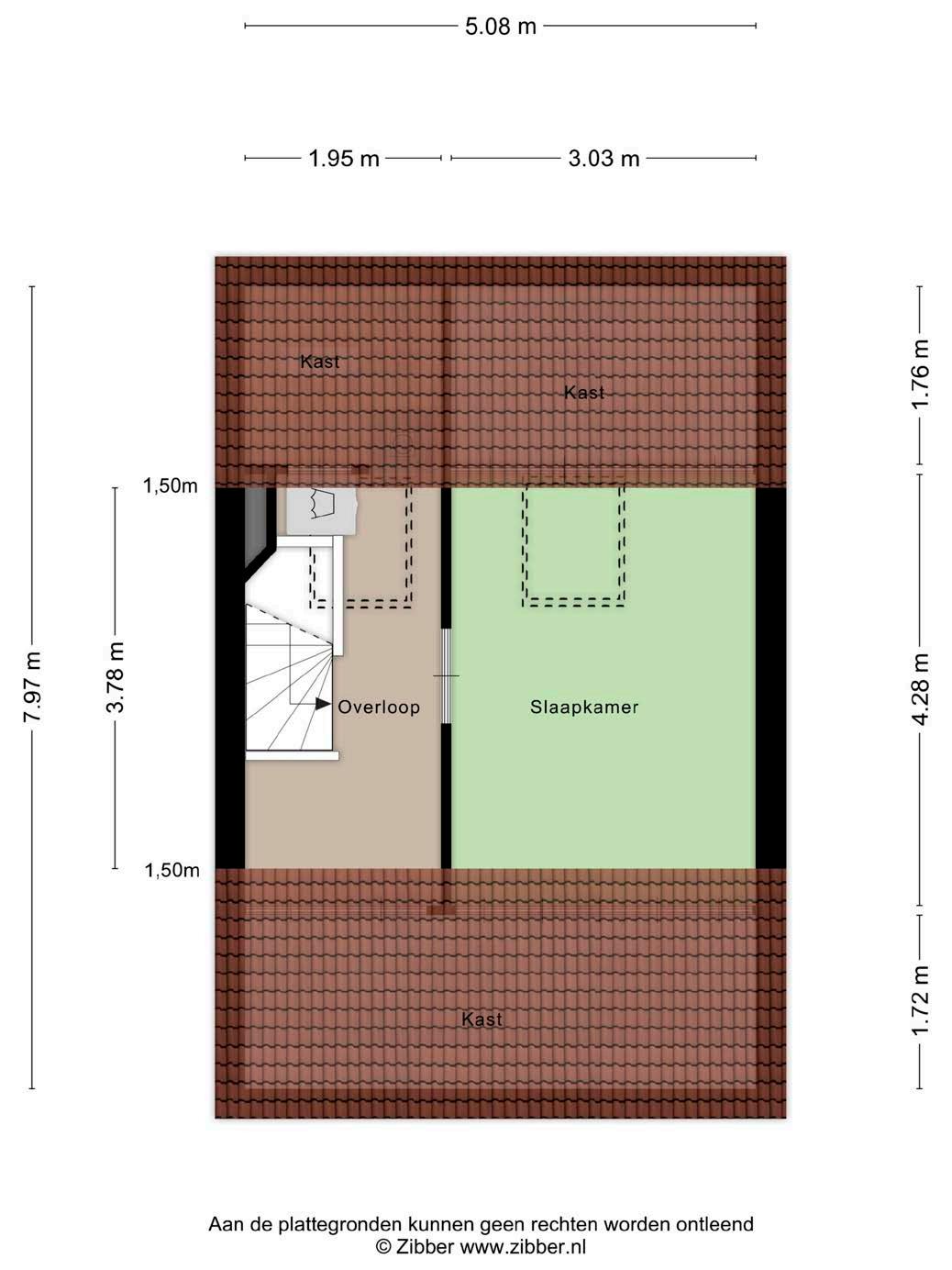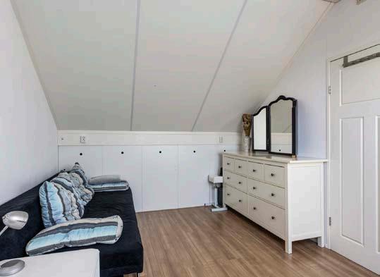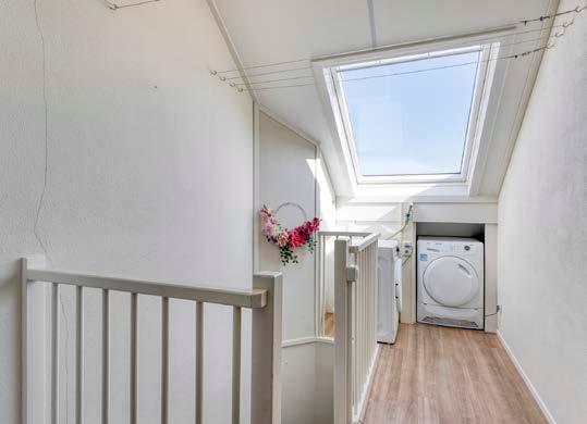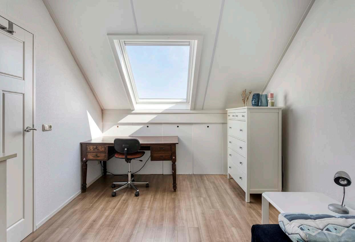 En dan is er nog de zolderverdieping. Via een vaste trap bereik je een ruimte vol potentie. Momenteel in gebruik als slaapkamer, is deze lichte kamer –dankzij het dakraam met zonsverduistering – ook perfect als werkkamer of hobbyruimte. De nette laminaatvloer en handige bergruimte onder de schuine kanten zorgen dat alles netjes en overzichtelijk blijft. En praktisch is het hier ook: in een afgesloten hoek vind je de aansluitingen voor de wasmachine en droger.