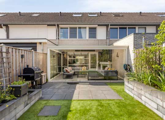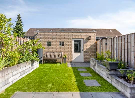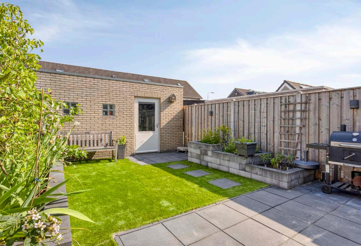 De achtertuin maakt het verhaal compleet. Volledig aangelegd met sierbestrating en onderhoudsarme plantenborders, biedt deze tuin een plek waar je écht kunt ontspannen. Van een barbecue met vrienden tot een koude limonade in de zomerzon – deze plek is gemaakt voor geluksmomenten. De stenen berging met achterom zorgt ervoor dat zelfs de fietsen een eigen plekje hebben.