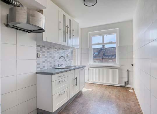 De keuken is eenvoudig met een keukenblok. Met plek voor een wasmachine én directe toegang tot het balkon is het een praktische ruimte waar je alles bij de hand hebt. Balkon is afgewerkt met rubberen vlonders en een inbouwkast waarin ook de CV-ketel is weggewerkt