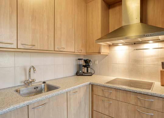 Aan de zijkant van de woonkamer vind je de ingerichte keuken. Deze is compact, maar slim ontworpen en bevat alles wat je nodig hebt om lekker te koken. De keuken is uitgerust met een keramische kookplaat, een ingebouwde vaatwasser, een combi-oven en een koelkast. Door de opstelling kun je hier gemakkelijk al jouw keukendromen waarmaken zonder ruimte tekort te komen.