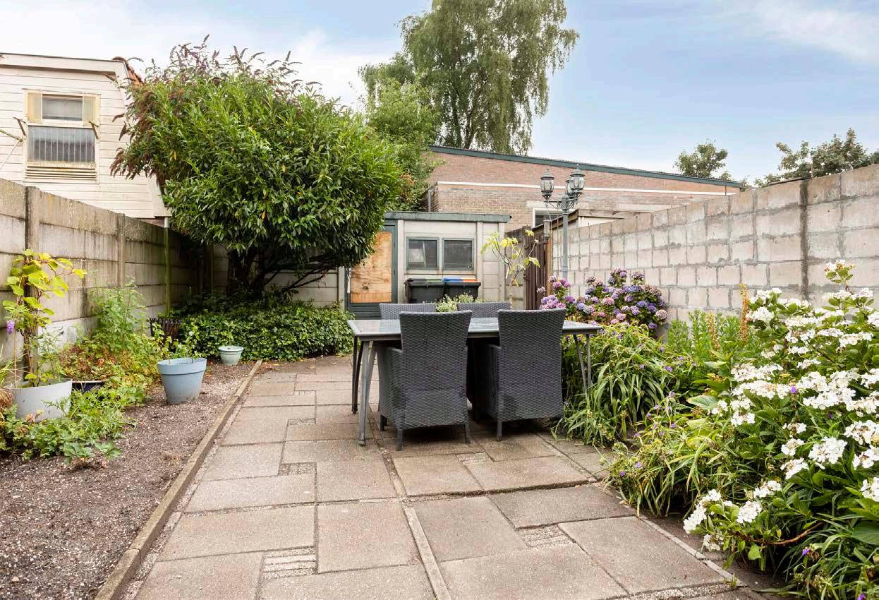 De keuken, aangrenzend aan de woonkamer, is praktisch en goed ingericht. De indeling biedt veel werkruimte, waardoor het koken hier echt een feestje wordt. Via de keuken stap je zo de zonnige achtertuin in, die op het zuidwesten ligt. Hier hoef je je geen zorgen te maken over licht en zon – van de ochtend tot in de namiddag kun je hier genieten van een fijn plekje buiten. De ruime berging achterin de tuin is perfect voor het opbergen van tuinspullen, fietsen en alle spullen die je liever niet in huis hebt.